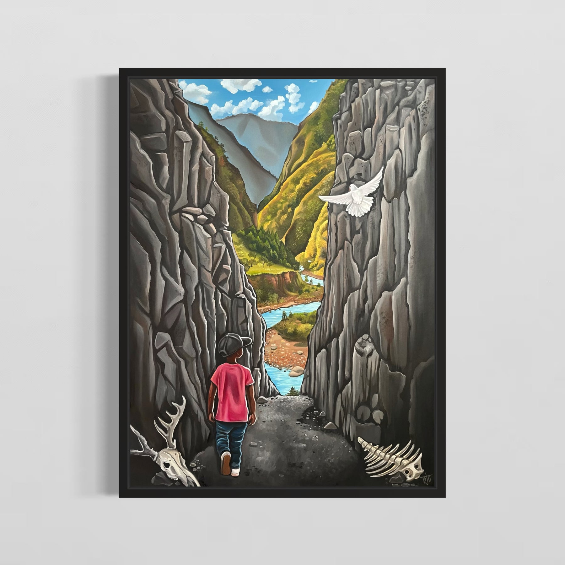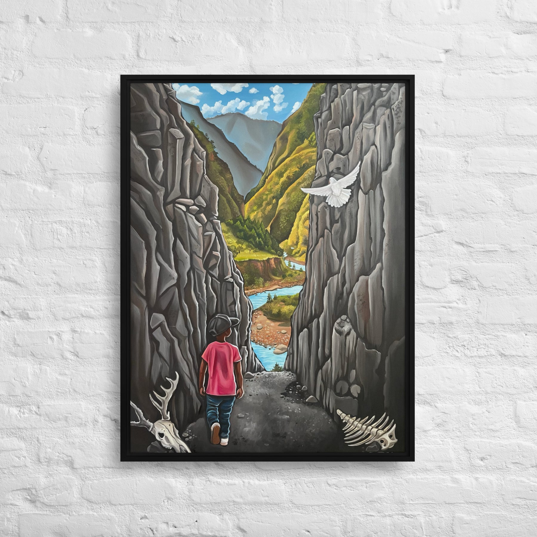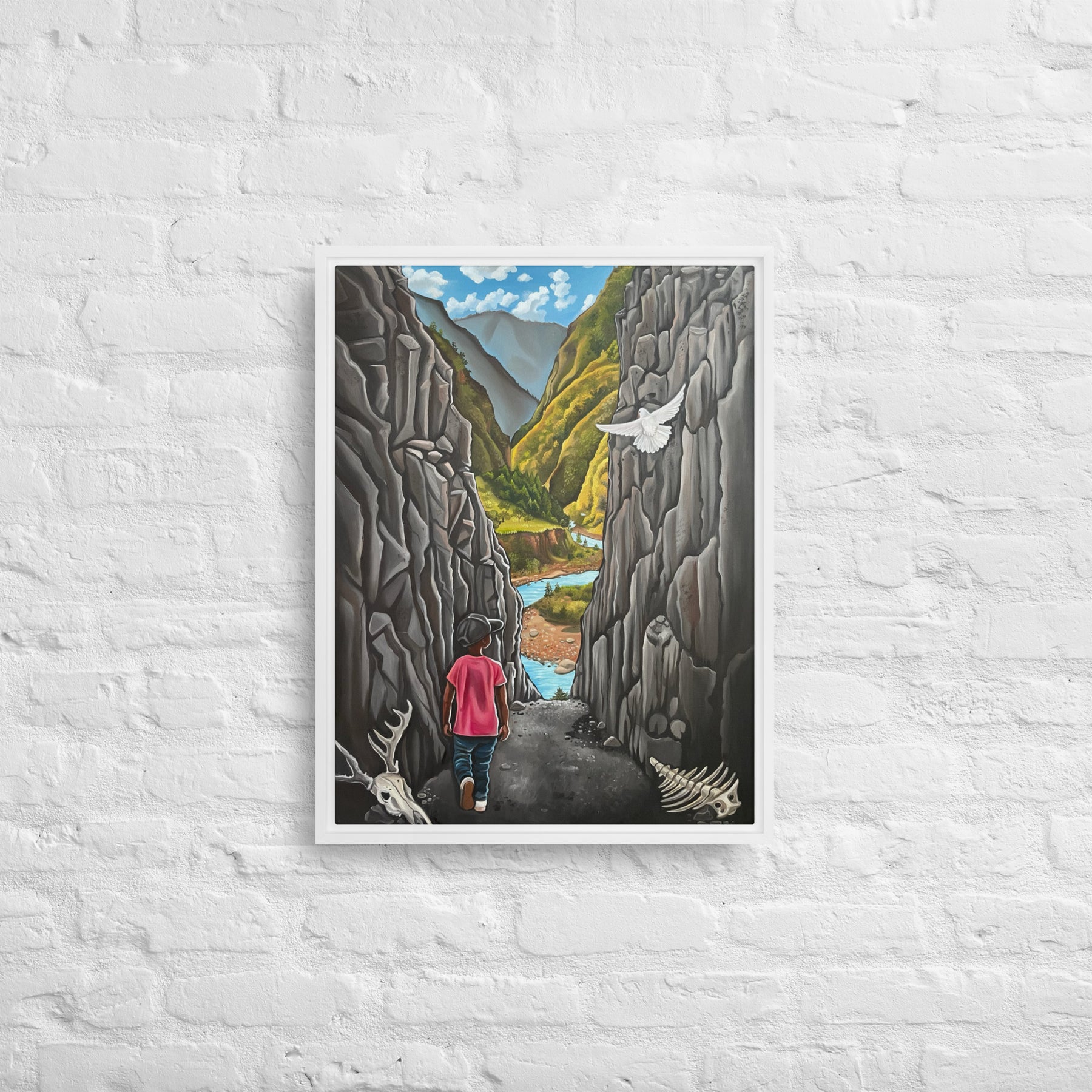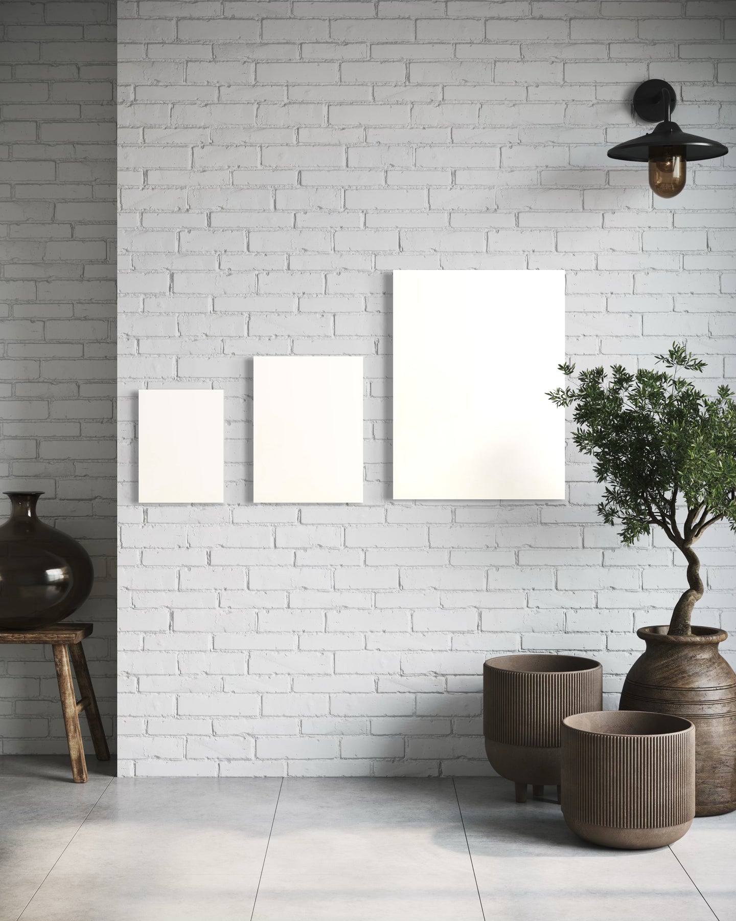 - The framed canvases with brown and black frames have a black inside around the canvas, and the canvases with white frames have a white inside around the canvas.